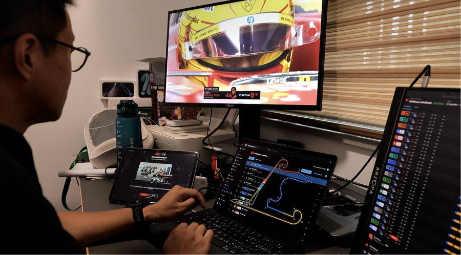 随着账号影响力不断增强,费翔也更新、升级着装备。他家最酷炫的两个角落,都是为产出优质内容而打造。一边,是放置了4块屏幕的工作台。每块屏幕都有功能,分别用来播放比赛全景、车手车载画面、比赛数据和记录,帮助他掌握全局、快速生产;另一边,是包含曲面屏、方向盘、基座和踏板的“模拟器赛车角”。这可不是为了娱乐。“借助模拟器了解分站赛道,输出的内容才更细致、扎实。”费翔说。